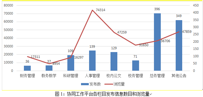 校内协同工作平台是教职工了解学校各项政策、规章制度、通知公告等相关信息的工作平台。截至2017年8月31日,学校各职能部门和院系在协同工作平台发布信息总计12944条,涉及财务、教学、科研、人事、公文等内容,访问量达到63.8万人次。其中,2016-2017学年,平台中校务管理、最新公文、财务管理、人事管理、科研管理、总务管理、教育管理、其他公告等栏目发布信息1056条,浏览量26.7万人次,基本与上一学年持平。